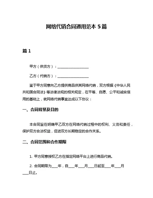 网络代销合同通用范本5篇全文共5篇示例,供读者参考篇1网络代销合同通用范本甲方:(委托人)地址:联系人:联系电话:乙方:(代销人)地址:联系人:联系电话:鉴于甲方拥有一定的商品资源,为了提高销售效率,特委托乙方通过网络推广、销售甲方商品,并由此达成以下协议:第一条甲方商品甲方商品由甲方提供,具体描述如下(商品名称、规格、品牌等)。