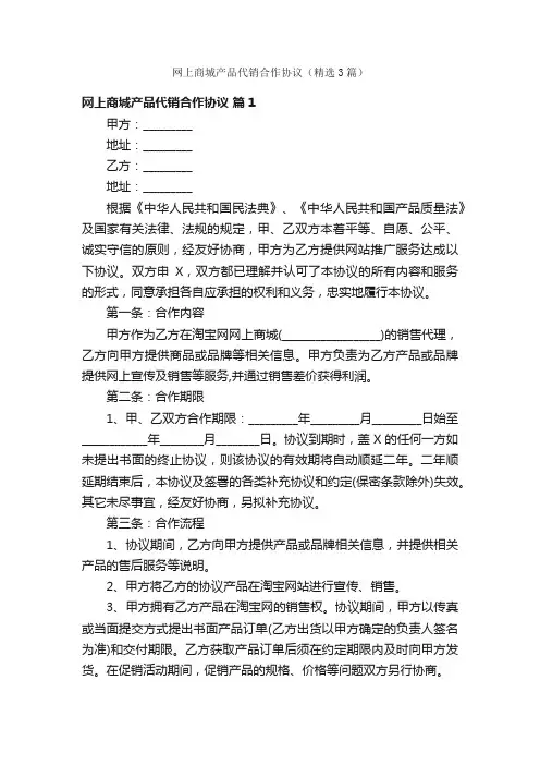 网上商城产品代销合作协议(精选3篇)网上商城产品代销合作协议篇1甲方:_________地址:_________乙方:_________地址:_________根据《中华人民共和国民法典》、《中华人民共和国产品质量法》及国家有关法律、法规的规定,甲、乙双方本着平等、自愿、公平、诚实守信的原则,经友好协商,甲方为乙方提供网站推广服务达成以下协议。
