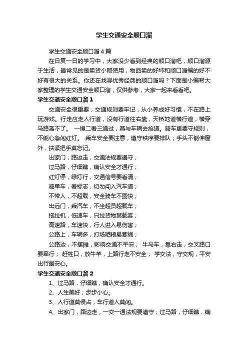 儿童交通学问顺口溜41、道路千万条,平安第一条2、讲交通公德,守交通法规3、文明驾驶保平安,美好祥和人快乐4、酒后开车,先醉人后坠车5、维护城市交通秩序,争做_文明市民6、多一分麻痹,多一分危急7、搞好畅通工程,创建平安大道,让_走向世界8、不讲卫生要生病,不讲平安要送命9、骑车撒把攀扶车辆危急万分!10、离交通法规愈近,距交通事故愈远儿童交通学问顺口溜5学校生上学去平安事要牢记上大路遵法律守法规别麻痹县乡道多弯曲路面窄弯道急大路上多警惕莫追赶莫玩耍莫扒车莫击石靠边走守法规横过路切莫急左右边看认真有车来当回避无车来再过去自行车上路骑十二岁才准骑年龄小违法律铃要响闸要制莫带人莫并驶莫逞强莫赌气心要专速要低需转弯早示意下大坡切勿骑推车行多有益学骑车广场里大路上莫学骑城市道宽又直各种道有隔离红绿灯多留意绿灯行红灯止莫抢道莫拥挤听指挥服管理访亲友乘车出讲礼貌守秩序车未停不能急车停稳再抬足下与上按挨次乘上车莫奇怪头和手莫伸出旅途安皆高兴学校生如旭日好习惯从小起学习好守纪律家长乐老师喜。