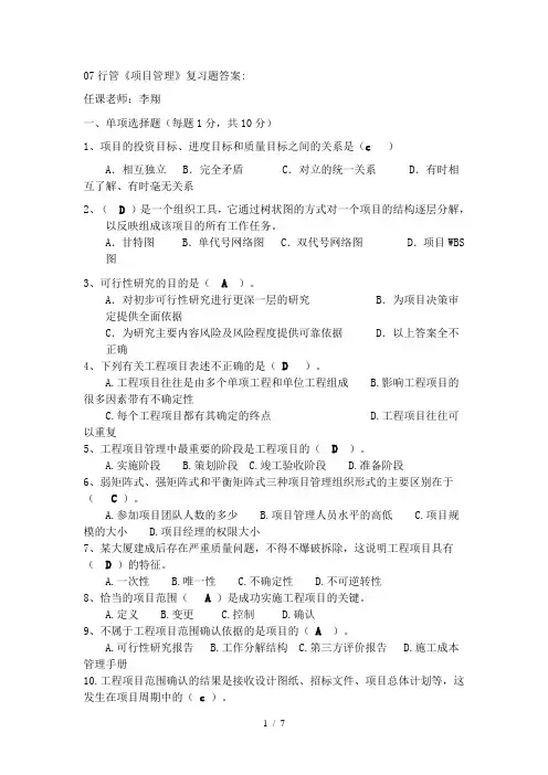 07行管《项目管理》复习题答案:任课老师:李翔一、单项选择题(每题1分,共10分)1、项目的投资目标、进度目标和质量目标之间的关系是(c)A.相互独立 B.完全矛盾 C.对立的统一关系 D.有时相互了解、有时毫无关系2、( D )是一个组织工具,它通过树状图的方式对一个项目的结构逐层分解,以反映组成该项目的所有工作任务。