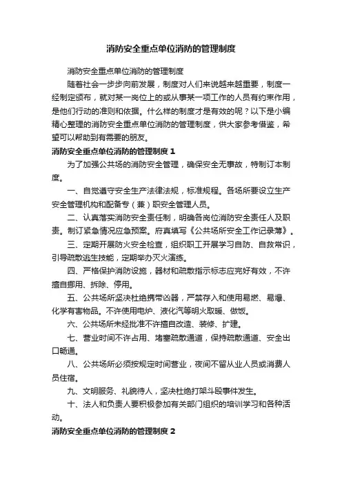 消防安全重点单位管理制度一、目的和适用范围1.1 目的本制度旨在确保消防安全重点单位的安全管理工作有序进行,减少火灾的发生,保护员工的生命财产安全。