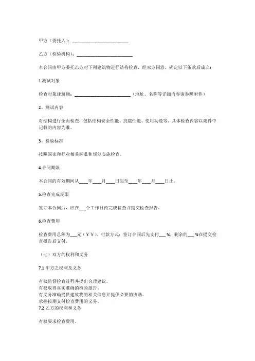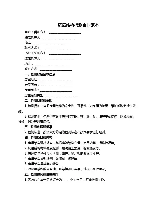 房屋结构检测鉴定合同模版甲方(委托方):________________乙方(检测方):________________鉴于甲方需要对其房屋进行结构检测鉴定,乙方具备相应的检测资质和专业技术能力,双方本着平等互利的原则,就房屋结构检测鉴定事宜达成如下合同:一、检测目的和范围1.1 乙方将对甲方位于__________(详细地址)的房屋进行结构安全检测。
