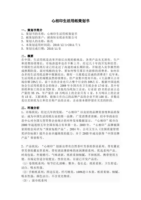 心相印生活用纸策划书一、策划书简介1、策划书的名称:心相印生活用纸策划书2、被策划的客户:湖南恒安纸业有限公司3、策划人的名称:陈亮4、本策划适用时间段:2010/12/1-2011/7/15、策划完成日期:2010/11/8二、概要在中国,生活用纸是改革开放后出现的舶来品,各类产品从无到有,生产和消费持续增长,市场渗透率也在不断上升。