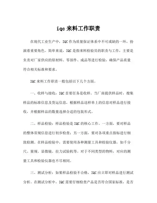 iqc来料工作职责在现代工业生产中,IQC作为质量保证体系中不可或缺的一环,扮演着重要角色。