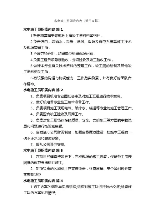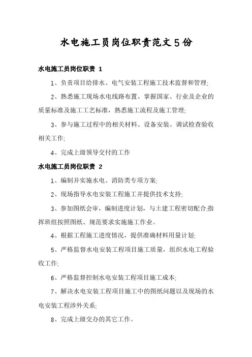 水电施工员岗位职责范文5份水电施工员岗位职责 11、负责项目给排水、电气安装工程施工技术监督和管理;2、熟悉施工现场水电线路布置、掌握国家、行业及企业的质量标准及施工工艺标准,熟悉施工流程及施工管理;3、参与施工过程中的相关材料、设备安装、调试检查验收相关工作;4、完成上级领导交付的工作水电施工员岗位职责 21、编制并实施水电、消防类专项方案;2、现场指导水电安装工程施工并提供技术支持;3、参加图纸会审,编制进度计划,与土建工程密切配合;指挥班组按照图纸、规范要求实施施工作业。