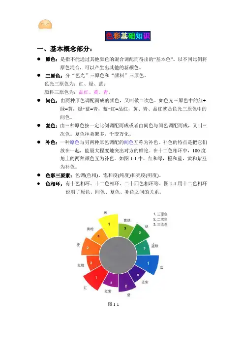 色彩基础知识一、基本概念部分:●原色:是指不能通过其他颜色的混合调配而得出的“基本色”。