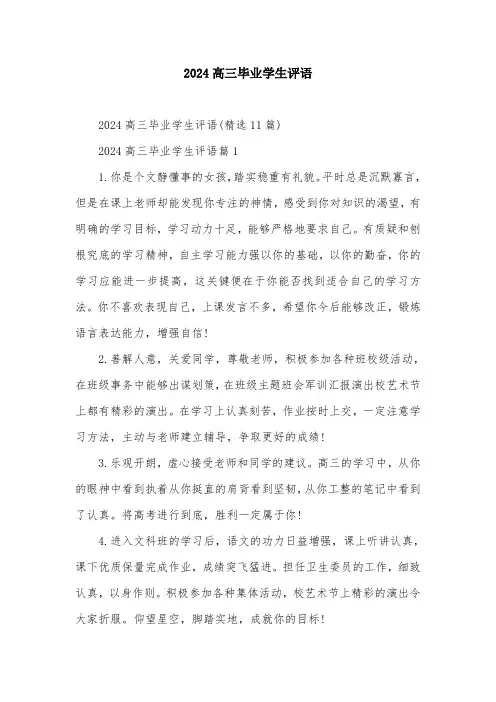 2024高三毕业学生评语2024高三毕业学生评语(精选11篇)2024高三毕业学生评语篇11.你是个文静懂事的女孩,踏实稳重有礼貌。