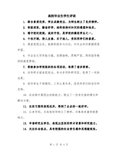 高校毕业生学生评语1. 综合素质优秀,学业成绩突出,为师生树立了良好榜样。