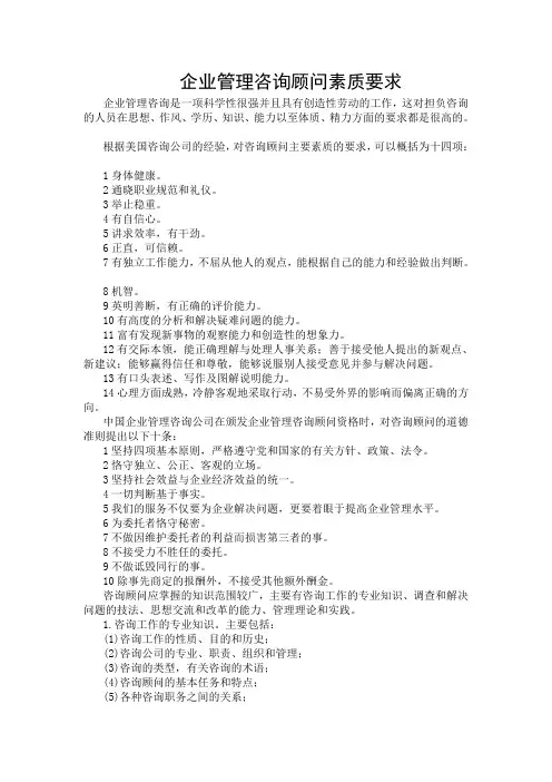 企业管理咨询顾问素质要求企业管理咨询是一项科学性很强并且具有创造性劳动的工作,这对担负咨询的人员在思想、作风、学历、知识、能力以至体质、精力方面的要求都是很高的。