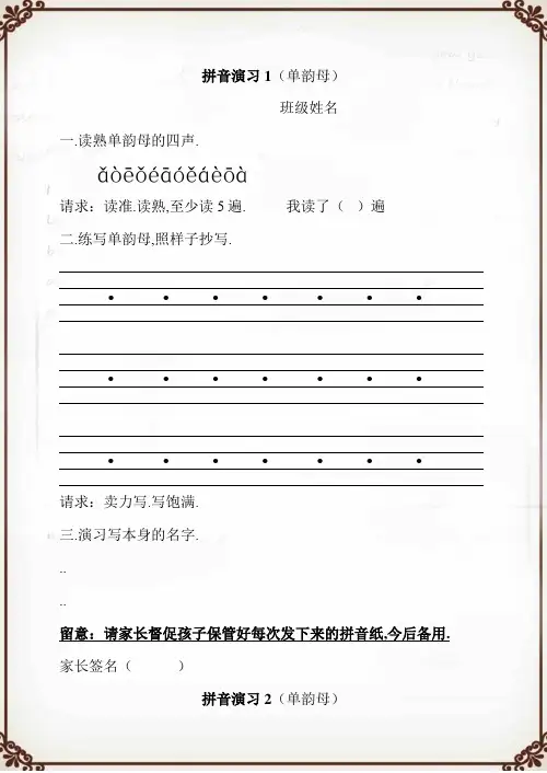 注意:请家长督促孩子保管好每次发下来的拼音纸,以后备用家长签名()拼音练习1 (单韵母)班级 ______ 姓名 ________________一、 读熟单韵母的四声。