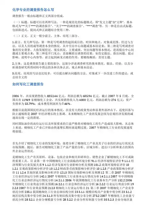 化工行业调研情况报告化工行业调研情况报告(一)、专业内容及特色方向本专业主要学习化学、化学工程学和化工工艺学等方面的基本理论和基本知识,受到化学与化工实验技能、工程实践、计算机应用、科学研究与工程设计方法的基本训练。
