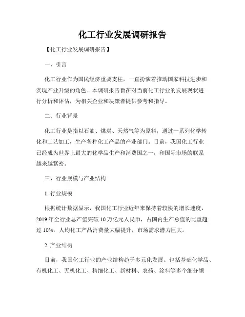 化工行业企业调研报告范文一、调研目的和背景本次调研旨在了解中国化工行业的发展情况、企业竞争力及市场前景,为投资者提供参考意见。