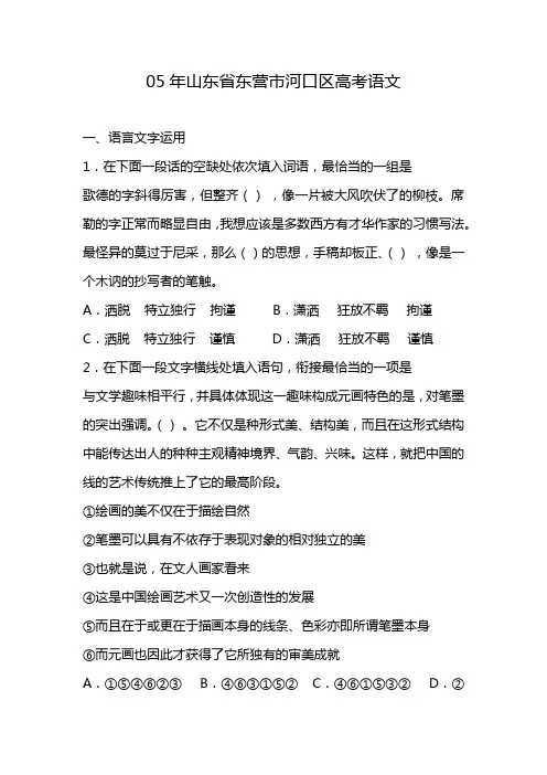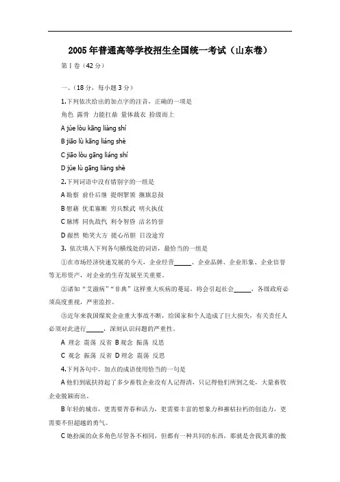 2005年普通高等学校招生全国统一考试(山东卷)第Ⅰ卷(42分)一、(18分,每小题3分)1.下列依次给出的加点字的注音,正确的一项是角色露骨力能扛鼎量体裁衣拾级而上A júe lòu kāng liàng shíB jiāo lù kāng liáng shèC jiāo lòu gāng liáng shíD júe lù gāng liàng shè2.下列词语中没有错别字的一组是A勘察前仆后继提纲挈领揠旗息鼓B慰藉优柔寡断穷兵黩武明火执仗C脉博同仇敌忾利令智昏沽名钓誉D赧然贻笑大方提心吊胆日没途穷3. 依次填入下列各句横线处的词语,最恰当的一组是①在市场经济快速发展的今天,企业经营_____、企业品牌、企业形象、企业信誉等无形资产,对企业的生存发展至关重要。