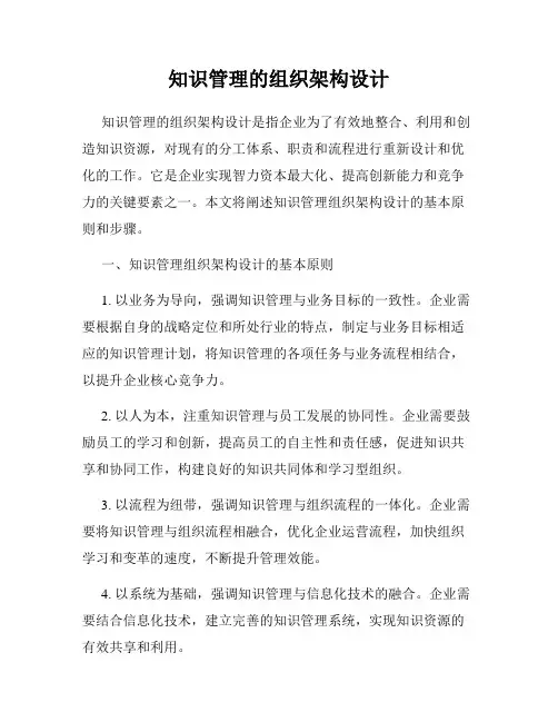 二、企业知识管理的组织架构设计1. 知识管理团队的建设企业需要建立专门的知识管理团队,该团队应该由来自不同部门的专业人员组成,包括知识管理专家、IT技术人员、市场营销专家等。