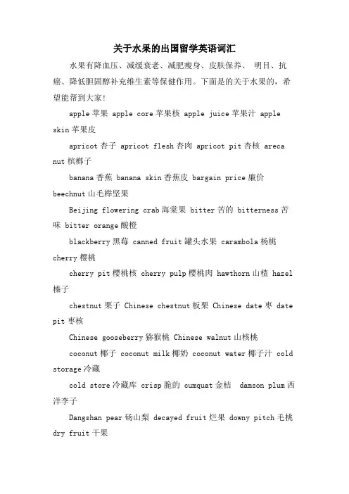 关于水果的出国留学英语词汇水果有降血压、减缓衰老、减肥瘦身、皮肤保养、明目、抗癌、降低胆固醇补充维生素等保健作用。