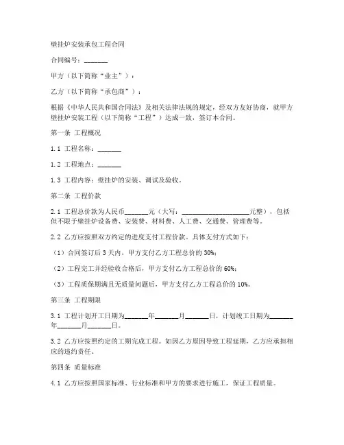 壁挂炉安装承包工程合同合同编号:_______甲方(以下简称“业主”):乙方(以下简称“承包商”):根据《中华人民共和国合同法》及相关法律法规的规定,经双方友好协商,就甲方壁挂炉安装工程(以下简称“工程”)达成一致,签订本合同。