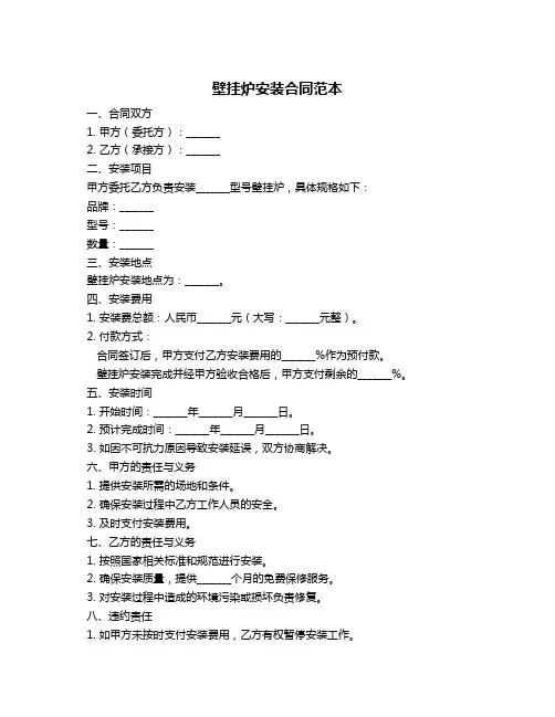 四、工程费用1. 乙方向甲方提供的壁挂炉安装服务费用为人民币【】元整(大写:【】元整)。