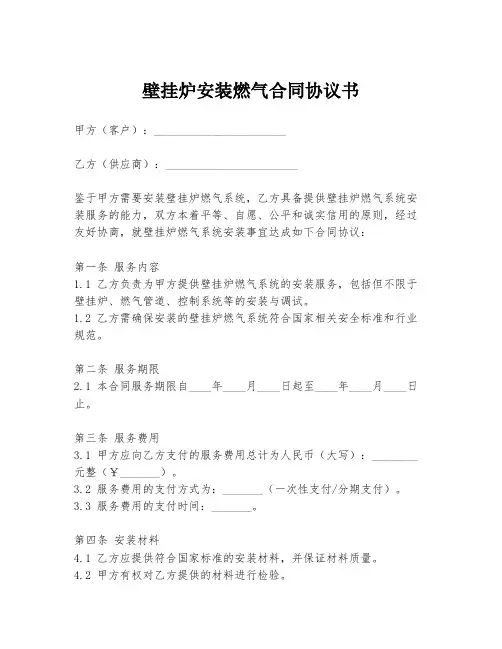 壁挂炉安装燃气合同协议书甲方(客户):_______________________乙方(供应商):_______________________鉴于甲方需要安装壁挂炉燃气系统,乙方具备提供壁挂炉燃气系统安装服务的能力,双方本着平等、自愿、公平和诚实信用的原则,经过友好协商,就壁挂炉燃气系统安装事宜达成如下合同协议:第一条服务内容1.1 乙方负责为甲方提供壁挂炉燃气系统的安装服务,包括但不限于壁挂炉、燃气管道、控制系统等的安装与调试。