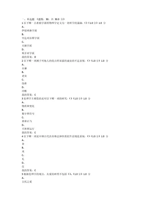 一、单选题(题数:30,共30.0分)1以下哪一古希腊学派将物理学定义为一切哲学的基础:()(1.0分)1.0分A、伊壁鸠鲁学派B、毕达哥拉斯学派C、犬儒学派D、斯多亚学派我的答案:D2以下哪一项属于对他人的优点所显露的诚实的不足表现:()(1.0分)1.0分A、自谦B、老实C、伪善D、冷酷我的答案:C3伦理学主要指的是对以下哪一项的研究:()(1.0分)1.0分A、物质和变化B、数字和符号C、善和正当D、天体和运行我的答案:C4以下哪一项是中国古代具有准法律性质的生活规范系统:()(1.0分)1.0分A、食B、戎C、礼D、住我的答案:C5根据伦理学的观点,友爱的种类不包括()。