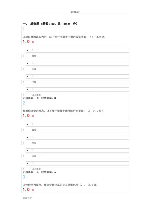 (1.0分)1.0分A、都相关于具体的实践事物B、都着眼于德性已经确立了的方向性的目的C、都相关于总体的善D、在思考人的实践理智活动的时候都采取一个理论的预设我的答案:D7家庭对于人的生活起点的影响具有以下哪一种特征:()(1.0分)1.0分A、预设的B、唯一的C、机械的D、自然的我的答案:D8以下哪一项是生命的两重性的表现:()(1.0分)1.0分A、最大和最小B、逆反和顺畅C、坚强和脆弱D、最优和最劣我的答案:C9友爱是朋友之间基于以下哪一种生活而发展的一种亲密的友好情感:()(1.0分)1.0分A、独立生活B、既定生活C、单一生活共同生活我的答案:D10根据伦理学的观点,道德与伦理之间的共同点是()。