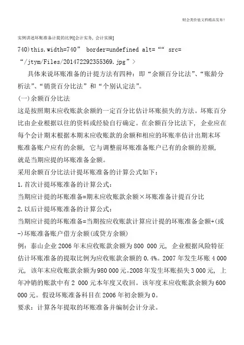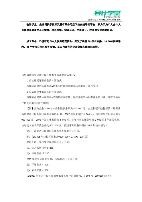 采用余额百分比法计提坏账准备的计算公式如下:1.首次计提坏账准备的计算公式:当期应计提的坏账准备=期末应收账款余额×坏账准备计提百分比2.以后计提坏账准备的计算公式:当期应计提的坏账准备=当期按应收账款计算应计提的坏账准备金额+(或-)坏账准备账户借方余额(或贷方余额)例:泰山企业2006年末应收账款余额为800 000元, 企业根据风险特征估计坏账准备的提取比例为应收账款余额的0.4%。