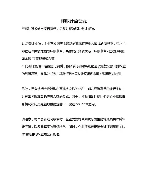 坏账计算公式主要有两种:足额计提法和比例计提法。