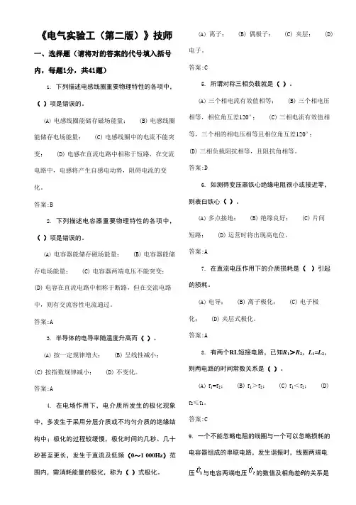 《电气实验工(第二版)》技师一、选择题(请将对的答案的代号填入括号内,每题1分,共41题)1. 下列描述电感线圈重要物理特性的各项中,()项是错误的。