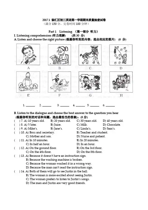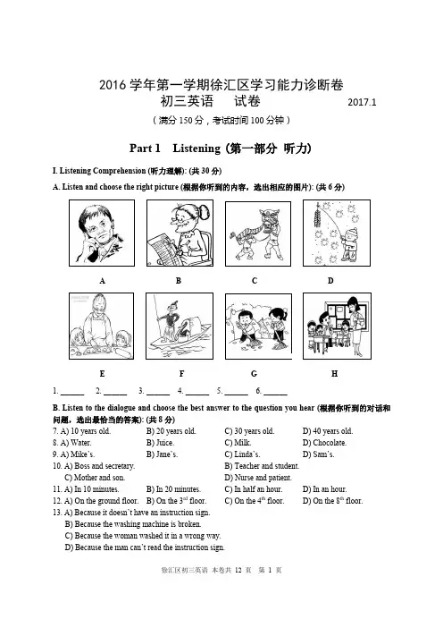 2016学年第一学期徐汇区学习能力诊断卷初三英语试卷2017.1(满分150分,考试时间100分钟)Part 1 Listening (第一部分听力)I. Listening Comprehension (听力理解): (共30分)A. Listen and choose the right picture (根据你听到的内容,选出相应的图片): (共6分)A B C DE F G H1. ______2. ______3. ______4. ______5. ______6. ______B. Listen to the dialogue and choose the best answer to the question you hear (根据你听到的对话和问题,选出最恰当的答案): (共8分)7. A) 10 years old. B) 20 years old. C) 30 years old. D) 40 years old.8. A) Water. B) Juice. C) Milk. D) Chocolate.9. A) Mike’s. B) Jan e’s. C) Linda’s. D) Sam’s.10. A) Boss and secretary. B) Teacher and student.C) Mother and son. D) Nurse and patient.11. A) In 10 minutes. B) In 20 minutes. C) In half an hour. D) In an hour.12. A) On the ground floor. B) On the 3rd floor. C) On the 4th floor. D) On the 8th floor.13. A) Because it doesn’t have an instruction sign.B) Because the washing machine is broken.C) Because the woman washed it in a wrong way.D) Because the man can’t read the instruction sign.14. A) Both of them will go to see Justin in the hall.B) The woman is more excited about seeing Justin.C) The woman prefers to listen to Justin’s songs.D) The man and Justin are very good friends.C. Listen to the dialogue and tell whether the following statements are true or false (判断下列句子是否符合你听到的内容, 符合的用“A”表示,不符合的用“B”表示): (共6分)15. Jerry has just spent his holiday at the seaside with his family.16. CoCo is also thinking about having a holiday at the seaside before Mother’s Day.17. The hotels Jerry introduces are very welcome and hard to get a room.18. Both of the hotels have a good location and are convenient to go around.19. The city center hotel is more suitable for people who like shopping.20. CoCo will probably choose to stay in the Hotel Bay View for relaxation.D. Listen to the passage and complete the following sentences (听短文,完成下列内容。