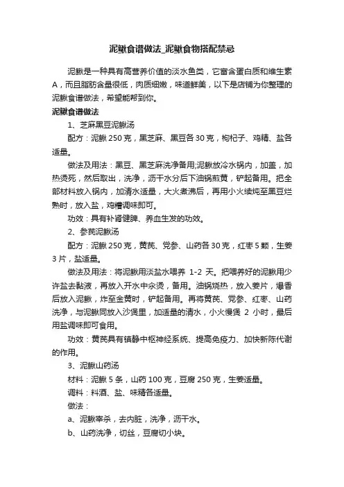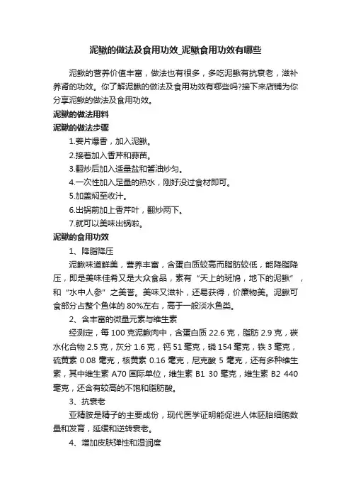 二、泥鳅的功效与作用:1. 补充营养:泥鳅肉质鲜嫩,富含优质蛋白质、维生素A、维生素E、维生素B2、维生素B12、磷、钙等多种营养成分,对于改善贫血、促进骨骼发育有一定的功效。