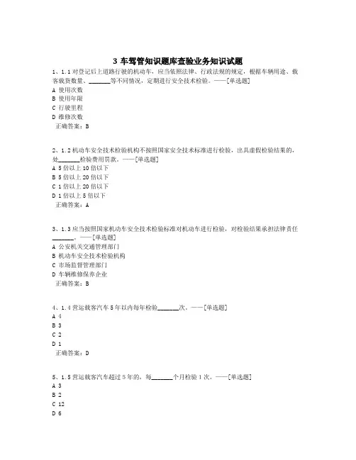 A、12B、3C、4D、6答案:D1.1.15 小型、微型非营运载客汽车6年以内每年检验1次A、1B、2C、3D、4答案:B1.1.16 小型、微型非营运载客汽车超过6年的,每年检验次。