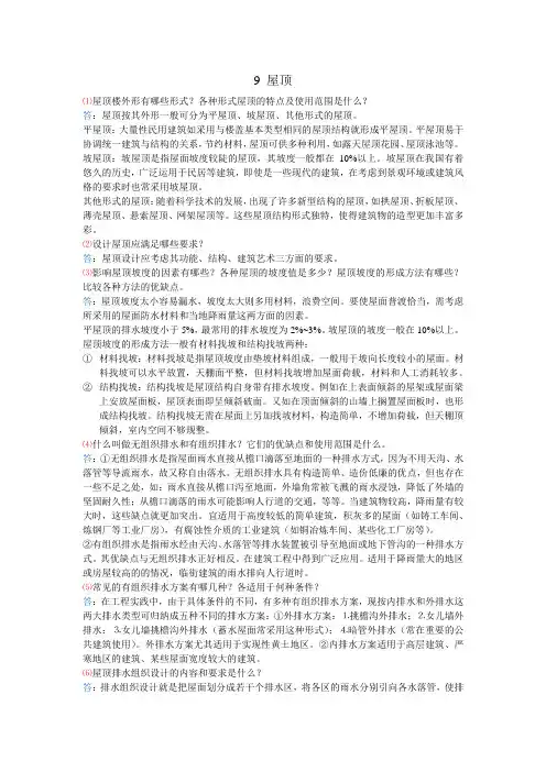 A、保温隔热B、防水、排水C、美观作用D、上人玩耍正确错误、屋面泛水应有足够的高度,最小为正确错误、根据建筑物的性质、重要程度、使用功能要求、防水层耐用年限、防水层选用材料和设防要求,将屋面防水分为五级。