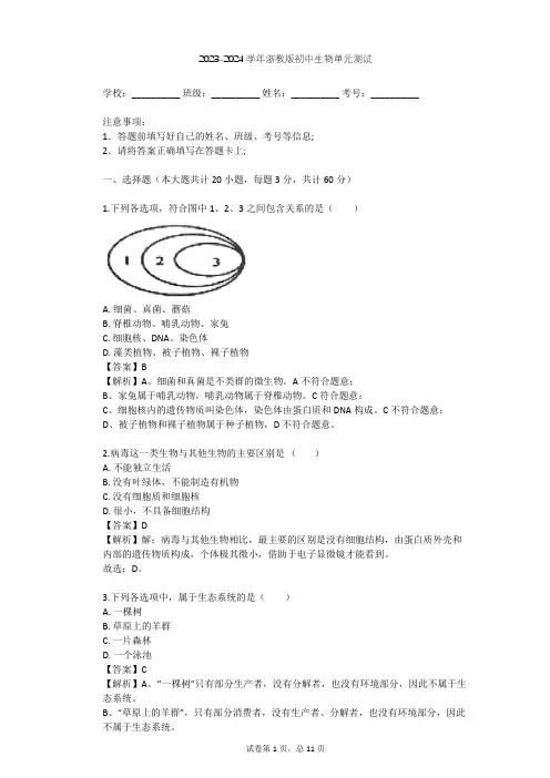 2023-2024学年浙教版初中生物单元测试学校:__________ 班级:__________ 姓名:__________ 考号:__________注意事项:1.答题前填写好自己的姓名、班级、考号等信息;2.请将答案正确填写在答题卡上;一、选择题(本大题共计20小题,每题3分,共计60分)1.下列各选项,符合图中1、2、3之间包含关系的是()A. 细菌、真菌、蘑菇B. 脊椎动物、哺乳动物、家兔C. 细胞核、DNA、染色体D. 藻类植物、被子植物、裸子植物【答案】B【解析】A、细菌和真菌是不类群的微生物。