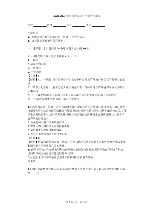 2023-2024学年浙教版初中生物单元测试学校:__________ 班级:__________ 姓名:__________ 考号:__________注意事项:1.答题前填写好自己的姓名、班级、考号等信息;2.请将答案正确填写在答题卡上;一、选择题(本大题共计13小题,每题3分,共计39分)1.在一个生态系统中,病毒和蘑菇通常属于哪种角色?()A. 分解者、生产者B. 生产者、消费者C. 消费者、分解者D. 消费者、生产者【答案】C【解析】病毒不能进行光合作用,它们是寄生在其他生物的活细胞内获取营养.因此属于消费者。