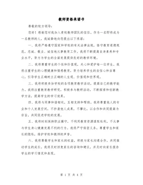 教师资格承诺书尊敬的校方领导:您好!感谢您对我加入贵校教师团队的信任。