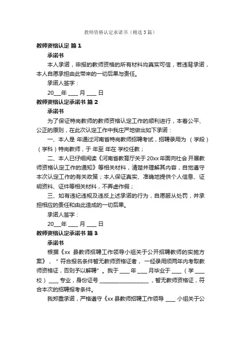 承诺人签字:20___年 ____ 月 ____ 日篇2:教师资格认定承诺书承诺书为了保证特岗教师的教师资格认定工作的顺利进行,本着公平、公正的`原则,在此次认定工作中我庄严地做出如下承诺:一、本人是年通过河南省特岗教师招聘考试,招聘录用为(学段)(学科)特岗教师,于年至年在学校任教;二、本人已仔细阅读《河南省教育厅关于20xx年面向社会开展教师资格认定工作的通知》等相关材料,清楚并理解其内容,自觉遵守本次认定工作的有关政策;本人保证真实、准确地提供个人信息、证明资料、证件等相关材料,不弄虚作假;三、如有违纪违规及违反上述承诺的行为,自愿服从处罚,并承担相应的责任和由此造成的一切后果。