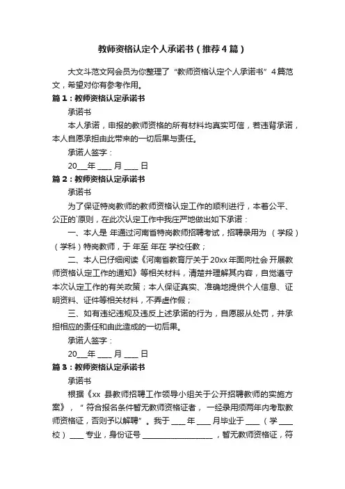 承诺人签字:20___年____月____日篇三:教师资格认定承诺书承诺书为了保证特岗教师的教师资格认定工作的顺利进行,本着公平、公正的`原则,在此次认定工作中我庄严地做出如下承诺:一、本人是年通过河南省特岗教师招聘考试,招聘录用为(学段)(学科)特岗教师,于年至年在学校任教;二、本人已仔细阅读《河南省教育厅关于20xx年面向社会开展教师资格认定工作的通知》等相关材料,清楚并理解其内容,自觉遵守本次认定工作的有关政策;本人保证真实、准确地提供个人信息、证明资料、证件等相关材料,不弄虚作假;三、如有违纪违规及违反上述承诺的行为,自愿服从处罚,并承担相应的责任和由此造成的一切后果。
