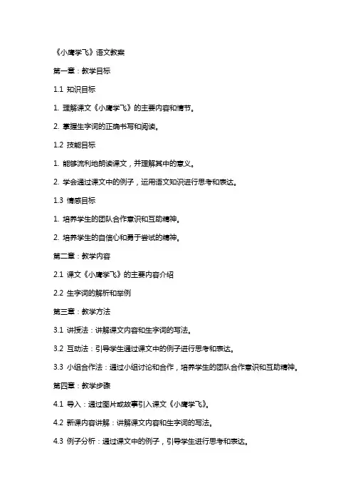 第二章:教学内容2.1 课文《小鹰学飞》的主要内容介绍2.2 生字词的解析和举例第三章:教学方法3.1 讲授法:讲解课文内容和生字词的写法。