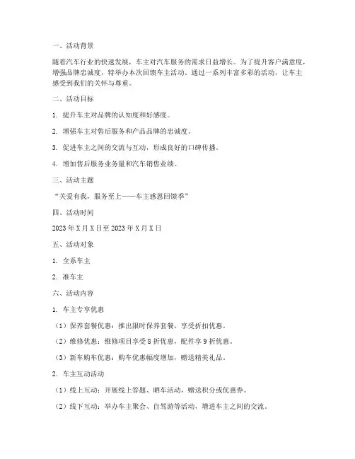 活动对象本活动针对购买本品牌汽车的消费者,以及已有本品牌汽车的车主。