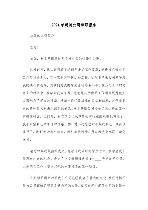2024年建筑公司辞职报告尊敬的公司领导:您好!首先,非常感谢您这两年来对我的信任和关照。