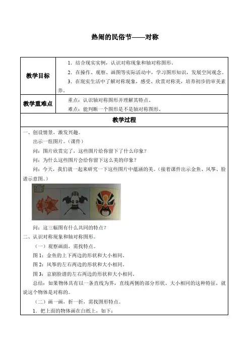 教学过程1. 导入:教师通过PPT展示热闹的民俗节图片,引导学生观察其中的对称元素,激发学生的学习兴趣。