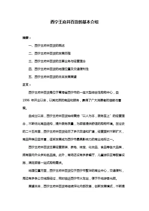 兰州市王府井百货各层导购摘要:1.兰州市王府井百货导购的概述2.各层导购的具体内容3.导购服务的重要性正文:兰州市王府井百货是一家集购物、餐饮、娱乐于一体的大型综合性商场,为广大消费者提供了丰富多样的商品和服务。