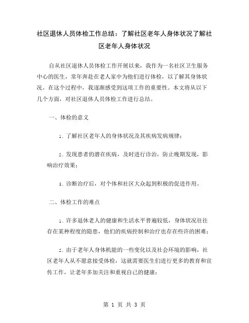 社区退休人员体检工作总结:了解社区老年人身体状况了解社区老年人身体状况自从社区退休人员体检工作开展以来,我作为一名社区卫生服务中心的医生,常年奔赴在老人家中为他们进行体检,以了解其身体状况。