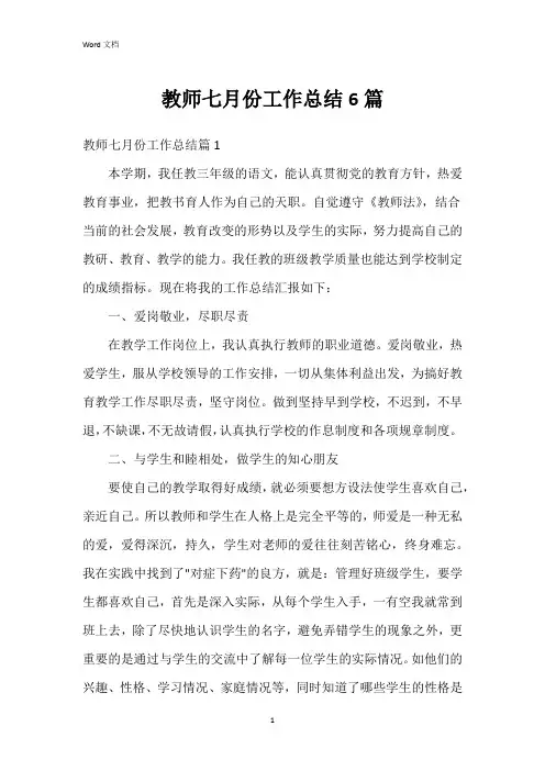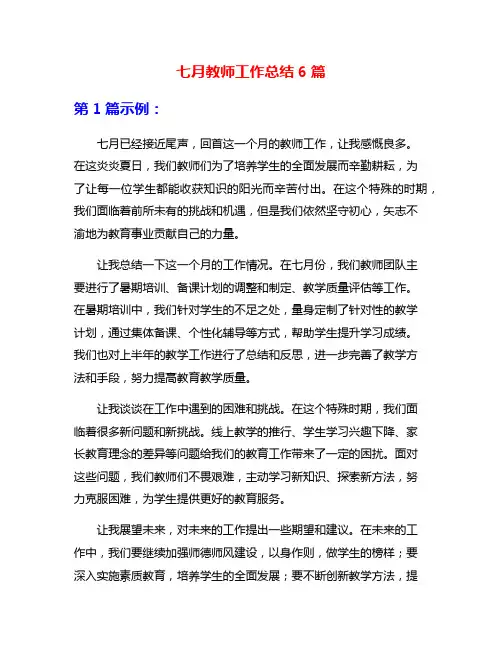 7月教师工作总结范文6篇第1篇示例:7月份是一年中教师们忙碌工作的时期,不仅需要完成上半年的工作总结,还要开始为新的学年做准备。