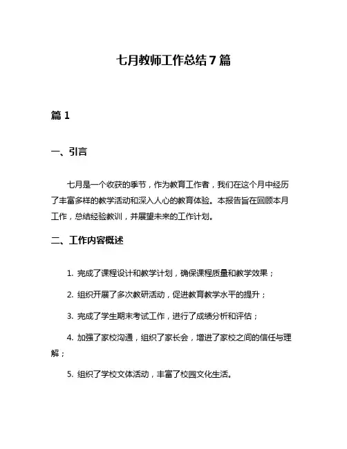 七月教师工作总结5篇篇1一、引言七月是一个收获的季节,作为教育工作者,我们在这个月中经历了丰富多样的教学活动和深入学生的互动。