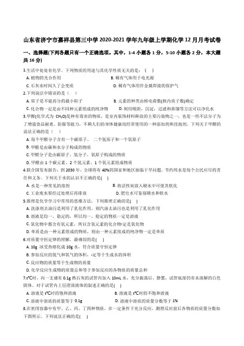 山东省济宁市嘉祥县第三中学2020-2021学年九年级上学期化学12月月考试卷一、选择题(下列各题只有一个正确选项。