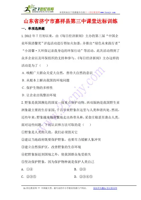 山东省济宁市嘉祥县第三中课堂达标训练一、单项选择题1.2012年7月初以来,由《每日经济新闻》主办的第三届“中国企业环保清馨奖”评选活动进行得如火如荼,并推出“绿色未来践行者”“小清馨·大环保记录我身边的环保行动”等活动。