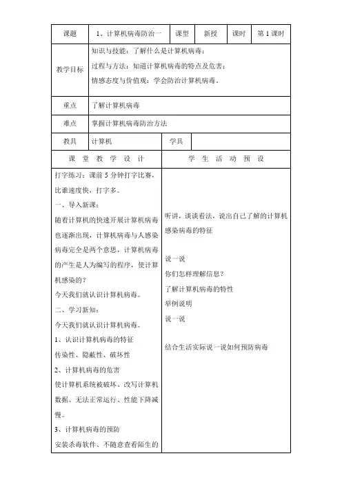 教学过程:第一课时一、导入新课1. 提问:同学们,你们知道什么是计算机病毒吗?它有什么危害?2. 引导学生思考,激发学习兴趣。