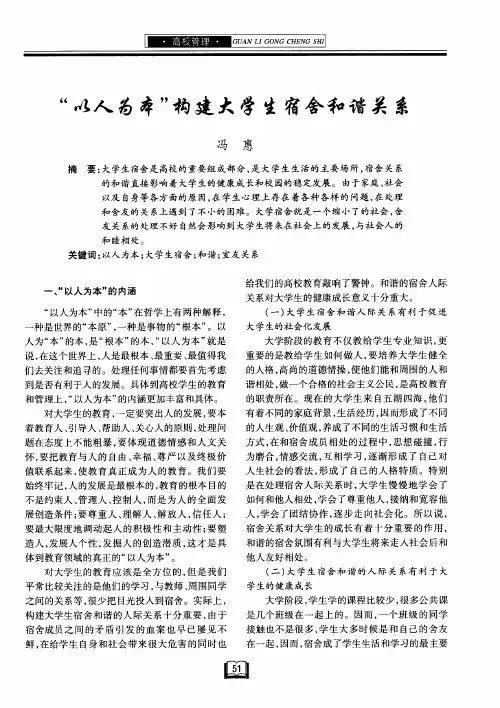 关键词:和谐校园;大学生宿舍;人际关系一、大学生宿舍人际关系现状与主要表现(一)大学生宿舍人际关系现状在学分制的影响下,行政班的概念正在淡化,学生宿舍逐渐成为大学生学习、休息、娱乐的主要场所,成为高校最有活力和最具特色的基本单位。