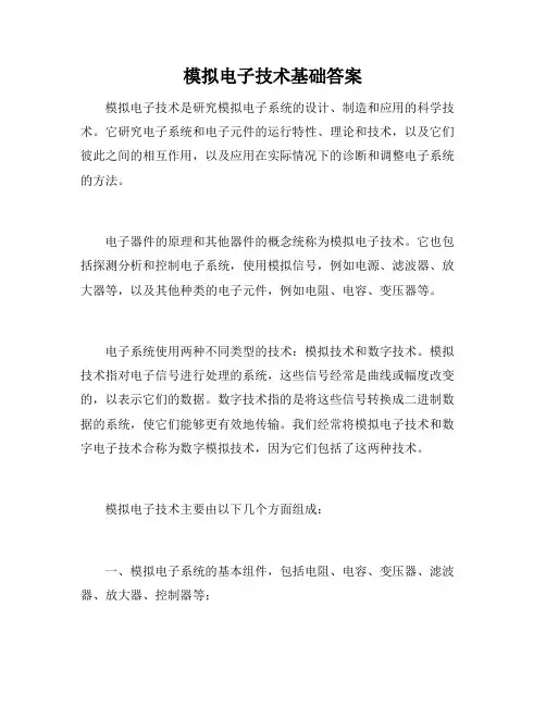2.为什么需要模拟电子技术?答:模拟电子技术在电子产品设计中起到了至关重要的作用,它可以将模拟信号进行放大、滤波、调制等处理,以满足各种应用需求。