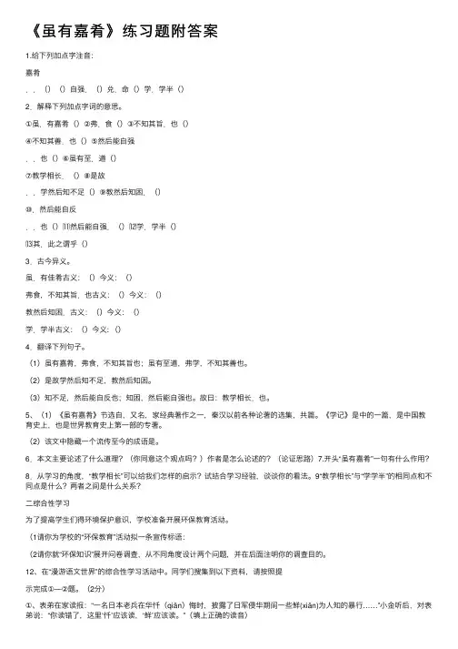 《虽有佳肴》练习(含答案)一、作品简介本文节选自《》,别名《》,儒家经典著作之一,秦汉从前各样论著的选集,《学记》是《礼记》中的一篇,是中国教育史上,也是世界教育史上第一部的专著。